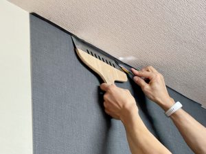 古いクロスの剥離、下地の補修・パテ処理。ここを丁寧に行うと仕上がりの差が歴然。 -